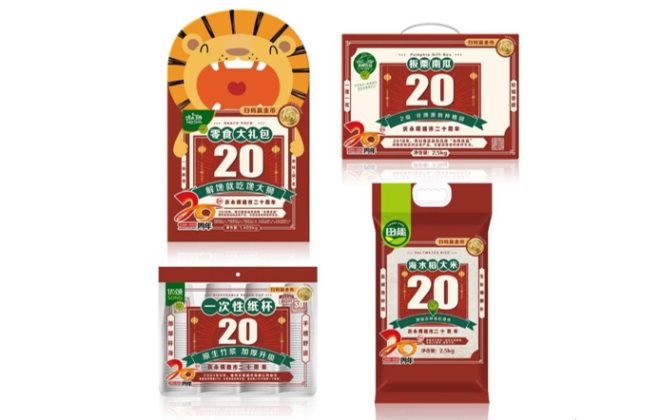 該設(shè)計(jì)主題圍繞著永輝20周年紀(jì)念以及“歡樂(lè)事件”的概念。在設(shè)計(jì)上,采用中國(guó)傳統(tǒng)象征喜慶的紅色和金色,再加上永輝標(biāo)志的元素。整體設(shè)計(jì)風(fēng)格呈現(xiàn)現(xiàn)代感,并彰顯20周年這一主題。通過(guò)這一系列產(chǎn)品,永輝持續(xù)提高自有品牌的滲透率。