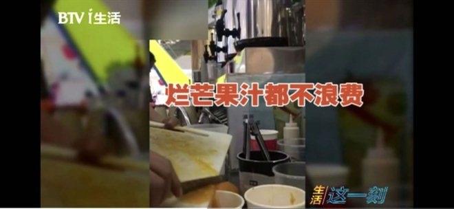視頻中顯示,甘茶度工作人員手抓垃圾、徒手切水果,并且大量水果原材料已經(jīng)腐爛變質(zhì),店員被要求將變質(zhì)與非變質(zhì)水果混搭使用,且當(dāng)天沒有售出的茶、水果第二天繼續(xù)使用。