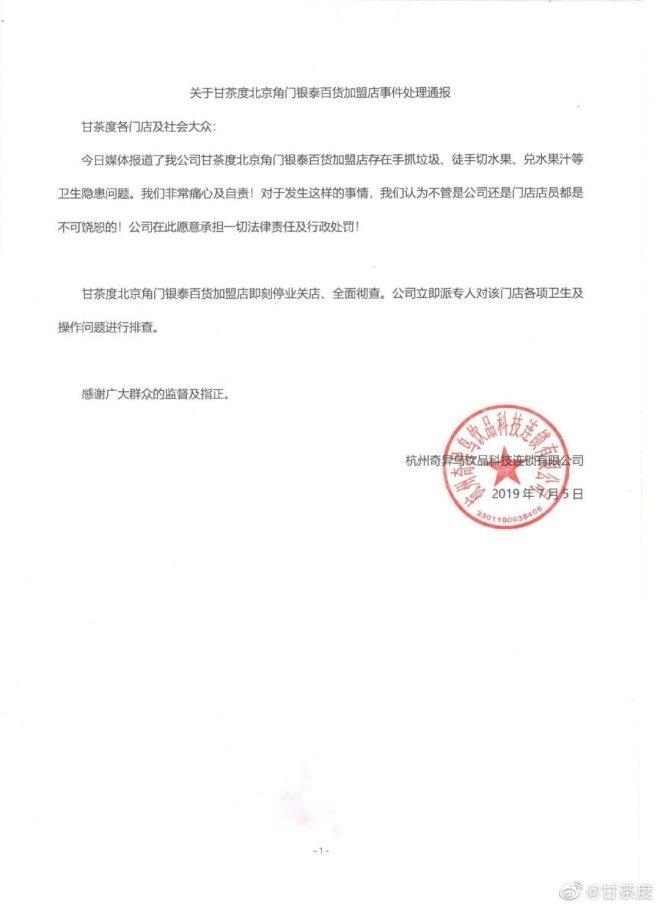 茶飲品牌甘茶度被曝存在嚴(yán)重衛(wèi)生問題。7月5日,一條記者臥底甘茶度后廚期間發(fā)現(xiàn)存在用料不新鮮、操作不規(guī)范等問題的視頻引起熱議。關(guān)于媒體報道的甘茶度北京角門店存在的衛(wèi)生隱患問題, 甘茶度官方微博發(fā)布《事件處理通報》表示,甘茶度北京角門加盟店即刻停業(yè)關(guān)店、全面徹查。