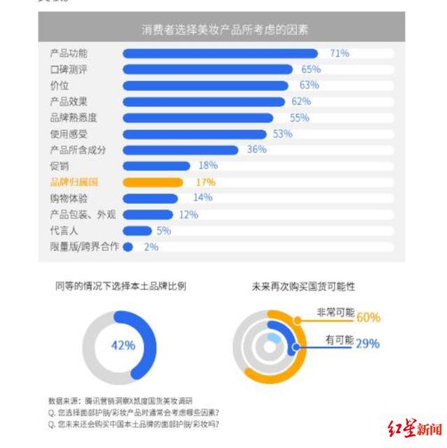 根據(jù)騰訊5月發(fā)布的2019年《國(guó)貨美妝洞察報(bào)告》顯示,中國(guó)美妝品牌占據(jù)市場(chǎng)份額的56%,同時(shí)有42%的消費(fèi)者更愿意選擇國(guó)貨美妝品牌,其中接近九成消費(fèi)者表示未來(lái)會(huì)回購(gòu)。