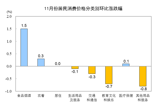 11月,全國居民消費(fèi)價(jià)格環(huán)比上漲0.4%。其中,城市上漲0.3%,農(nóng)村上漲0.5%;食品價(jià)格上漲1.8%,非食品價(jià)格持平;消費(fèi)品價(jià)格上漲0.8%,服務(wù)價(jià)格下降0.4%。