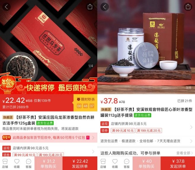 ▲云嶺茶葉帶來的莊園烏龍茶和大師鐵觀音,在拼多多年貨節(jié)期間,兩款產(chǎn)品還在原有價格基礎(chǔ)上推出了限時優(yōu)惠。