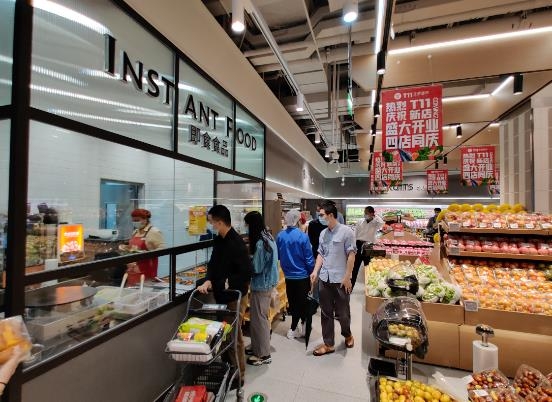 與前三家面積在4000多平米左右,SKU達7000多,位于商場或社區(qū)內的門店相比,9月23日試營業(yè)的T11國奧中心店則是社區(qū)型的臨街門店。在不足1000平的門店里,圍繞當地商圈社區(qū)居民一日三餐的家庭生活場景而打造的4000多SKU的T11國奧店,簡潔而不簡單。