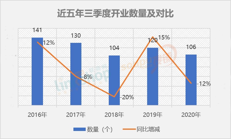 從同比增減度角度看,近五年中有兩年的開業(yè)數(shù)量是同比上增的,且在經(jīng)歷了兩年的同比下跌后,2019年三季度逆勢(shì)上漲了15%,2016年三季度的大幅度放量,讓2017和2018兩年的同期比略有下滑,但開業(yè)量同樣保持在百個(gè)的水平。2020年同比下滑了12%,屬正?,F(xiàn)象,雖然有因疫情耽誤工期而被迫延期開業(yè)的因素,但三季度開業(yè)的項(xiàng)目也有不少是前兩個(gè)季度延期下來的。