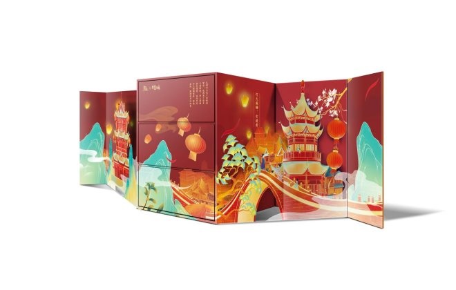 其中,“萬(wàn)家燈火”禮盒以中華第一燈“長(zhǎng)信宮燈“為創(chuàng)作靈感,禮盒展開(kāi)是一整幅的萬(wàn)家燈火畫(huà)面,寓意萬(wàn)家燈火點(diǎn)亮國(guó)人的親情守望,以及對(duì)新一年的美好期盼。“瑞氣東升”禮盒以現(xiàn)存最早的摹繪世界地圖“坤輿萬(wàn)國(guó)全圖”為靈感,禮盒展開(kāi)后會(huì)升起全幅原創(chuàng)手繪的萬(wàn)里江山圖,世界珍寶盡現(xiàn)眼前,寓意持有者一帆順風(fēng),富甲四方,祈福迎新。