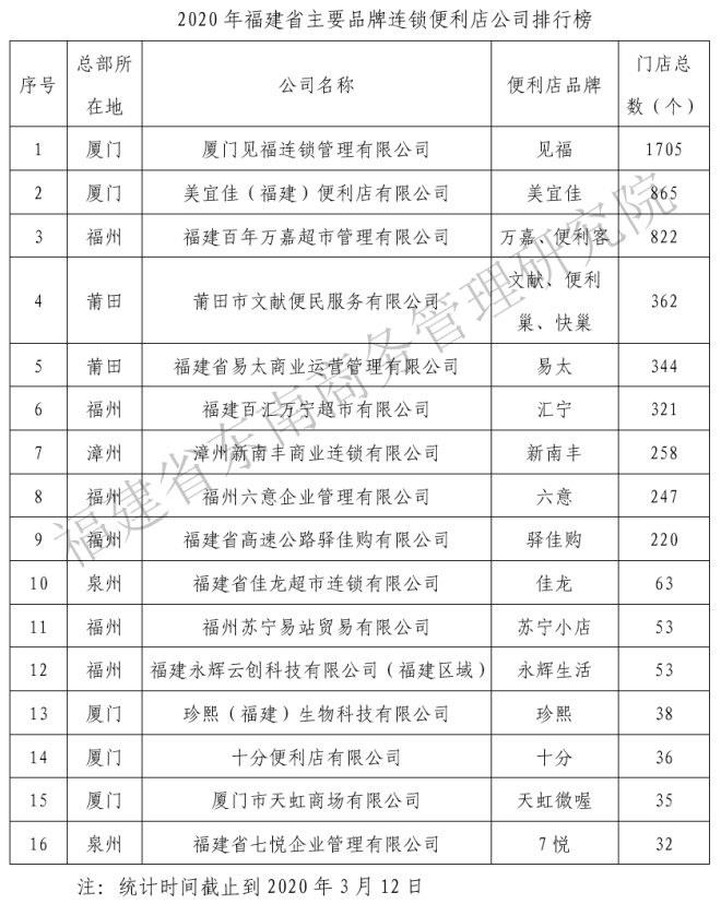 福建便利店16強門店總數達5454家 見福居首