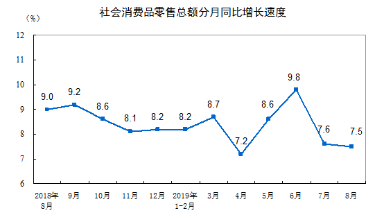 8月全國社會消費品零售總額同比增長7.5%
