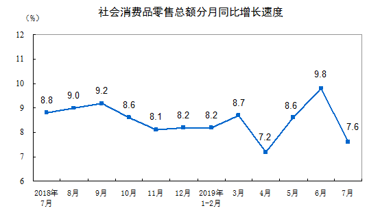 7月全國社會消費品零售總額同比增長7.6%