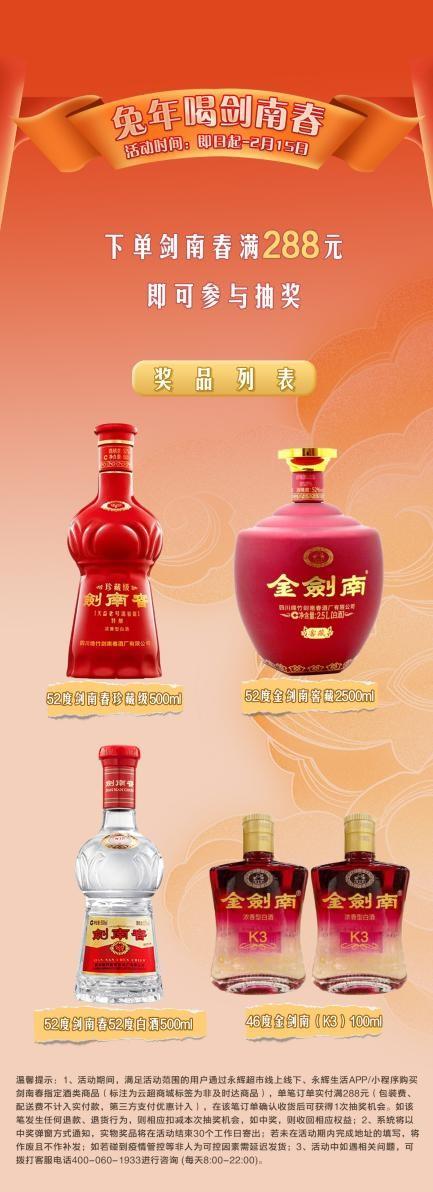 另外,即日起到2月15日,在永輝生活-詠悅匯酒庫平臺買劍南春滿288元即可參與抽獎,獎品有52度劍南春珍藏級500ml(1瓶)、52度金劍南窖藏2500ml(1瓶)、52度劍南春52度白酒500ml(1瓶)、46度金劍南(K3)100ml(2瓶)。