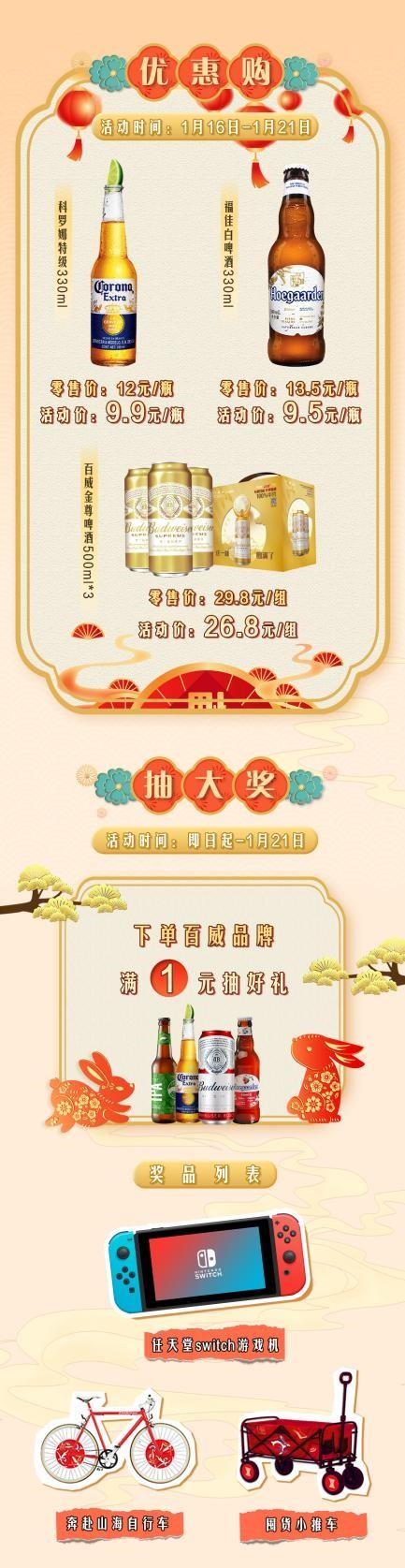 即日起到1月21日,永輝生活-詠悅匯酒庫平臺發(fā)放百威品牌5元無門檻優(yōu)惠券(限時搶,當天可使用)、百威品牌99減30元大額券(當天可使用)。而且同時期,下單百威品牌滿1元抽好禮,可以抽任天堂switch游戲機、奔赴山海自行車、囤貨小推車精美獎品。