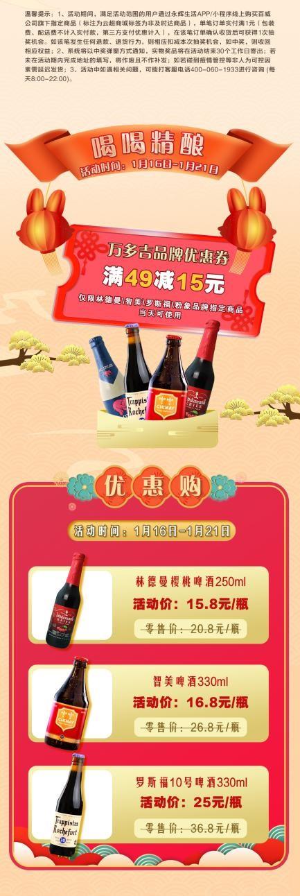 喜歡喝精釀啤酒的也不要錯過詠悅匯酒庫“好運在兔,酒在一起”活動。從1月16日到1月21日,在永輝生活-詠悅匯酒庫平臺上能領(lǐng)取到萬多吉品牌滿49減15元優(yōu)惠券(當天可使用),可購買林德曼、智美、羅斯福、粉象品牌指定商品。