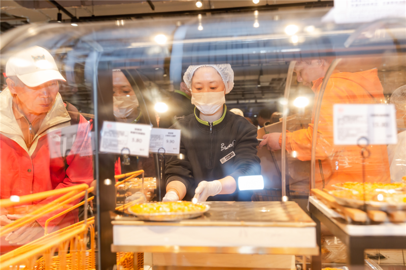 開業(yè)當(dāng)天,最受顧客青睞的還屬熟食和烘焙區(qū),現(xiàn)場制作的炸雞、烤腸,熱氣騰騰,新鮮出爐的面包,煙火味兒十足。