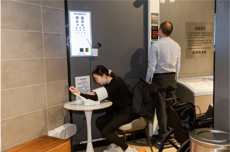 服務(wù)上,增設(shè)了便民服務(wù)區(qū),為顧客免費(fèi)提供自助測(cè)量血壓、身高、體重等便民設(shè)施,休息區(qū)也常備自助飲水機(jī)、常用藥和愛心糖果,還有現(xiàn)場加熱、免費(fèi)冰袋等服務(wù),設(shè)置了免費(fèi)充電區(qū),并針對(duì)性地推出了母嬰室和寵物寄存柜等。
