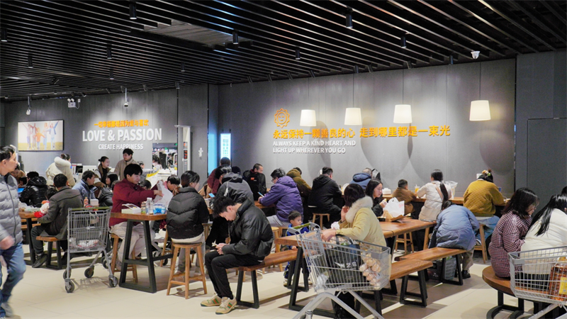 “我以前就是這家超市的???,沒想到調(diào)改后變化這么大?,F(xiàn)在熟食產(chǎn)品種類很多,不想做飯來這邊買點現(xiàn)成的,買完單在顧客休息區(qū)就可以用餐,方便了很多?!眲倓傁掳嗟膹埮恳贿吿暨x商品一邊說。而永輝超市新增的顧客休息區(qū)坐滿了用餐和休息的顧客,休息區(qū)里洗手池、濕紙巾、直飲水、一次性水杯、血壓計、身高體重測量儀等便民設施一應俱全,除了用餐的顧客,也有不少顧客在休息區(qū)量身高體重、測血壓。