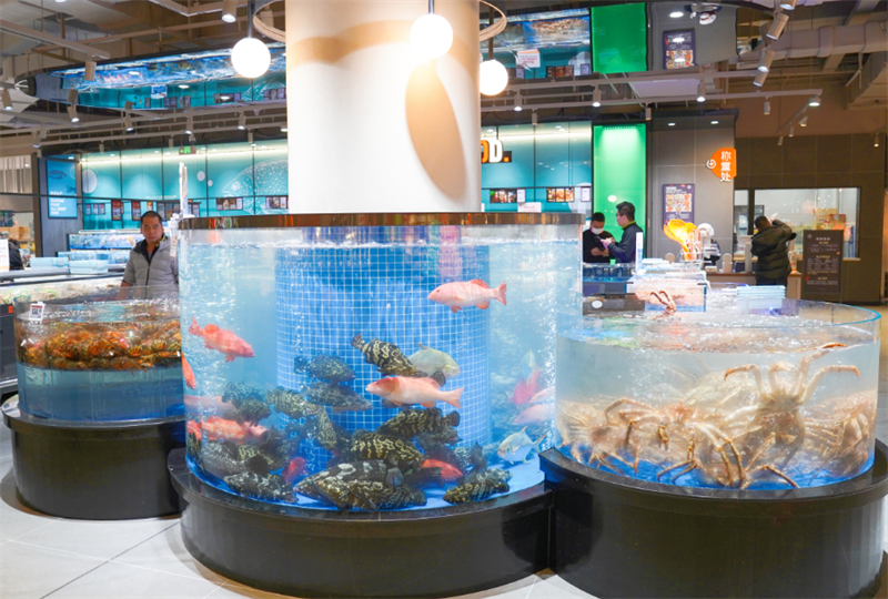 為匹配消費(fèi)者的個(gè)性化需求,奧體店精心打造了整體場景,由胖東來天使城工程團(tuán)隊(duì)全程參與,發(fā)揮了極大的想象力,設(shè)計(jì)以淺灰色為主色調(diào),搭配橙色標(biāo)識(shí)裝飾增添活力,動(dòng)線通道自由、寬敞,點(diǎn)綴幽藍(lán)色的觀賞海鮮魚缸,更添氛圍感。