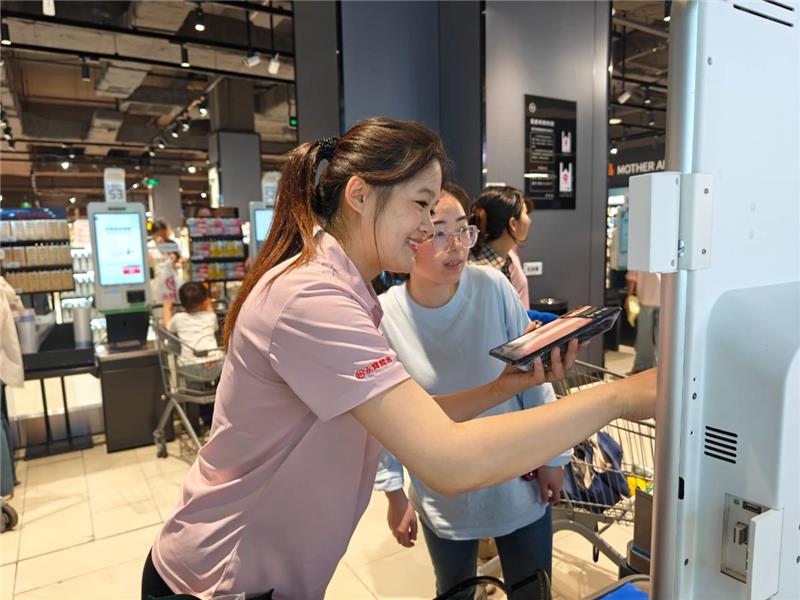 在北京鴻坤廣場店客流高峰時段,收銀支援員工王麗正嫻熟地疏導(dǎo)著排隊人群。“您好,這邊可以結(jié)賬,請跟我來!”她面帶微笑,用清晰有力的指引聲,將推著滿載購物車的顧客分流至不同收銀通道。面對持續(xù)涌入的顧客,王麗始終保持著專業(yè)的工作節(jié)奏,一邊快速判斷各通道結(jié)賬進度,一邊及時補位支援。這看似重復(fù)的引導(dǎo)工作,實則是保障顧客購物體驗的關(guān)鍵環(huán)節(jié)——正是這些基層員工日復(fù)一日的專業(yè)服務(wù),構(gòu)筑起超市高效運轉(zhuǎn)的服務(wù)基石。