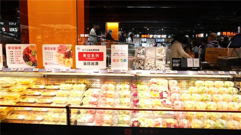 在永輝,鮮度與價格形成透明對話。貨架上的折價標(biāo)簽不再是模糊的促銷手段,而成為鮮度變化的品質(zhì)坐標(biāo),商品經(jīng)歷價格調(diào)整時,時間與原因清晰標(biāo)注,構(gòu)建起透明的鮮度追蹤機制。而針對果切這類“嬌貴”商品,四小時后打上八折標(biāo)簽,六小時則進入六折區(qū)間,八小時后果斷撤離貨架。這種將時間價值化的管理機制,讓消費者在挑選時多了一份安心。“上次買的打折的果切,口感依然清甜如初。”一位顧客分享道。